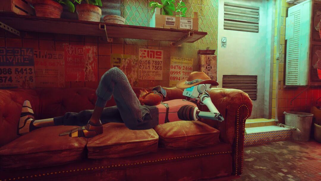 Luckily, we have the purr-fect escape from the mundane thrill, diving into cozy pockets of serenity where the game’s ambient beats create a cozy cocoon around us. We can chill out in the nooks and crannies of the game, snatching a few z’s to the sickly atmospheric tunes, all while a smooth camera pan glorifies us and our chill spot. And that’s just the beginning. This kitty’s got claws for days, ready to give any piece of furniture or rug the ol’ one-two punch. What about playtime? We’re all about that – batting balls, knocking pots and bottles off their perches. And when we’re feeling cuddly? We’re all over those humanoid robots, hugging their legs and basking in their pure, unadulterated joy. But hey, we’re not always the cuddly type – sometimes we’re the prankster, throwing ourselves in front of these wandering tin cans on legs and watching them stumble. Total cat move, right?