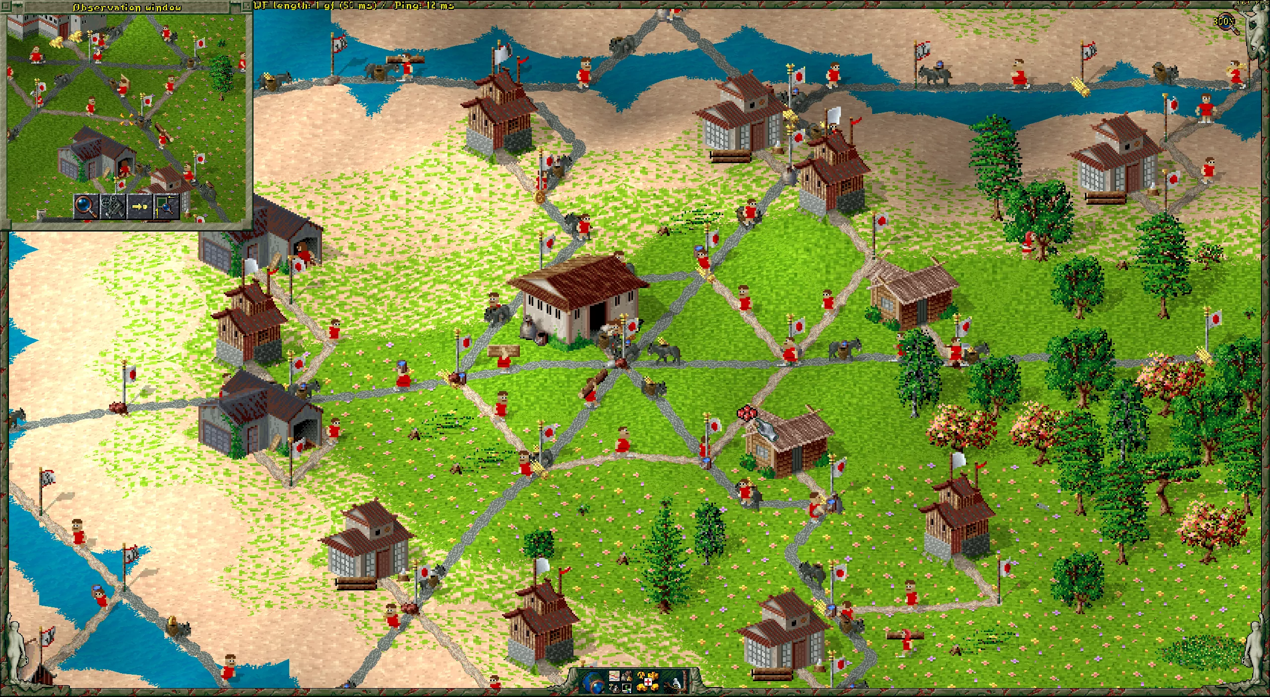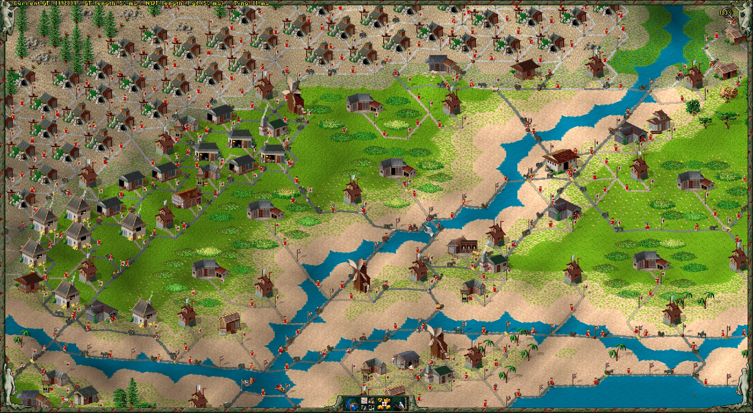 Right now, I’m running the latest nightly build of Return to the Roots on free game mode against the AI, playing mostly as the Japanese (for aesthetic reasons – and who knows, maybe this early fascination with East Asian pixel art is where my eventual move to Sài Gòn started) and the Babylonians, that beautiful fifth nation RttR introduced over a decade ago. Both the wine and leather economy addons are enabled, alongside a generous handful of RttR’s other gameplay-adjusting addons (infinite mines FTW!).