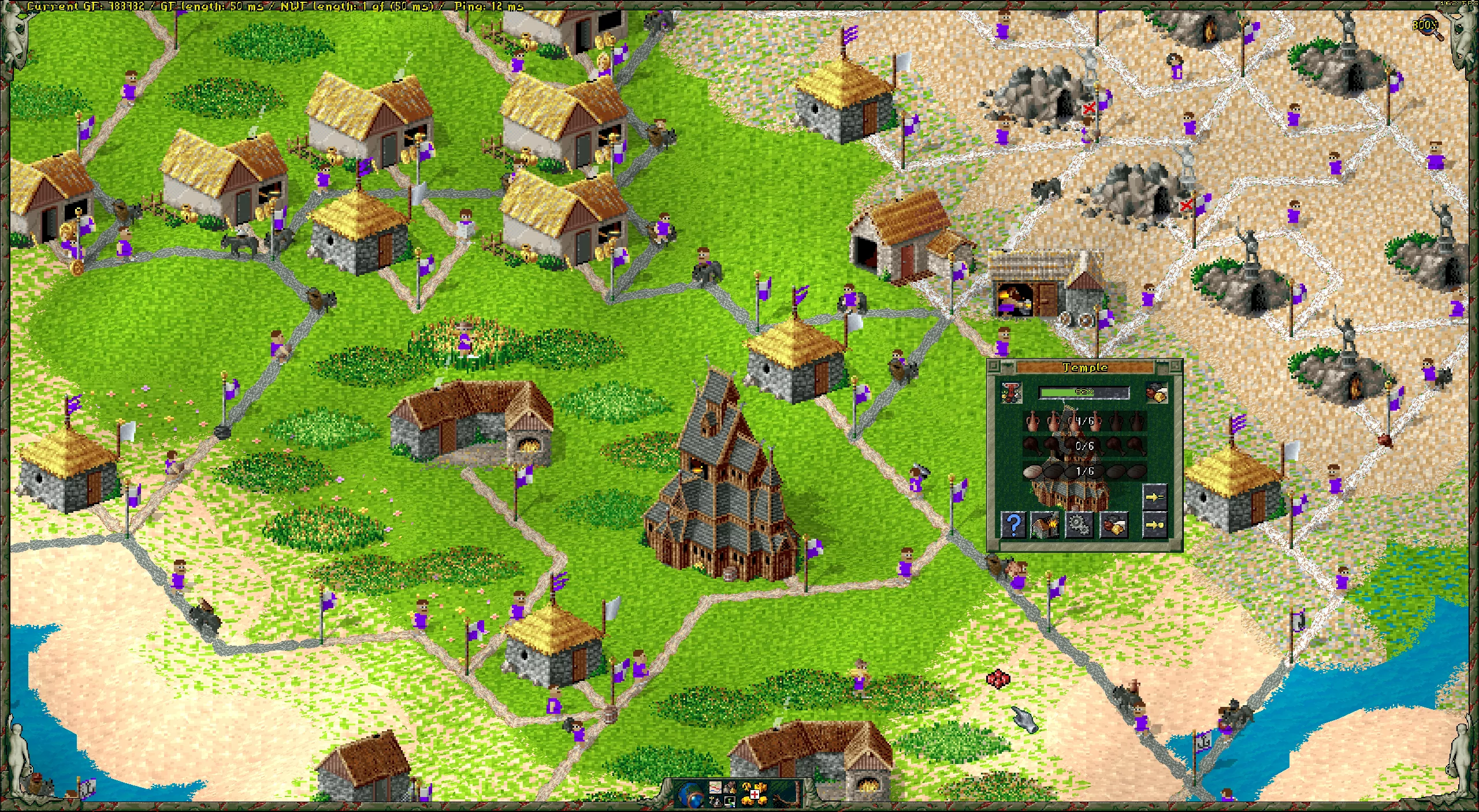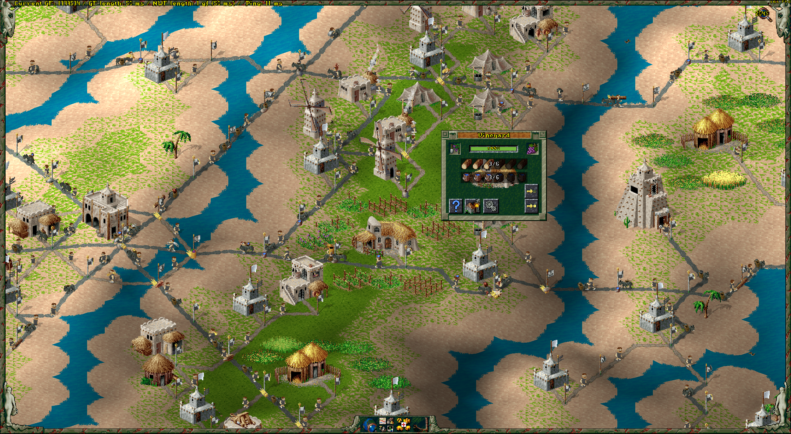 This changes the endgame dramatically. In the original Settlers 2, once the mines were exhausted, your economy stagnated. Full stop. The wine economy provides an alternative production chain that rewards players who invest in farming infrastructure and balance their wood and water economies carefully. It doesn’t compete with the charcoal burner (which produces coal from a single building on beach or desert terrain) but rather complements it. Two food per mineral, plus the entire vineyard-to-temple pipeline, means it’s a serious investment – not a shortcut.